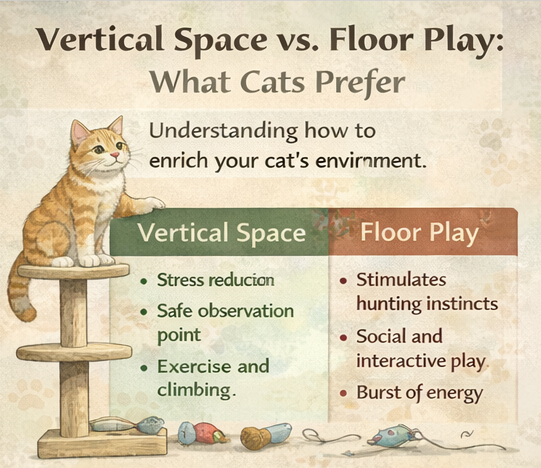 So, vertical or floor—which wins? The evidence leans toward vertical space as a stronger preference, especially for stress reduction and overall welfare. In shelter and café settings, cats consistently chose elevated areas over floor-level ones when given options. This aligns with their prey-predator duality: heights provide safety and observation, while floor play is more about active hunting.