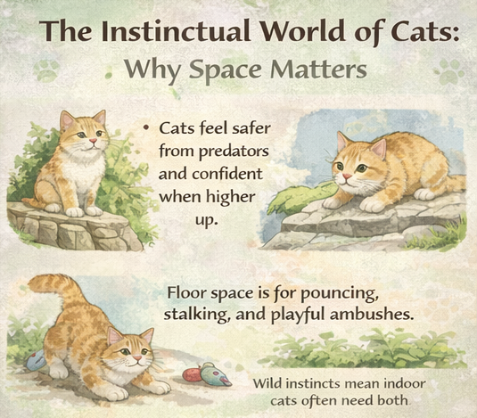 Cats aren't just domesticated fluffballs; they're descendants of wild felines like the African wildcat, who spent their days hunting, hiding, and climbing to survive. In the wild, vertical spaces—think trees or rocky ledges—offer safety from predators, a vantage point for spotting prey, and a way to establish territory without constant ground-level conflicts. Floor space, on the other hand, is prime for pouncing, stalking, and playful ambushes that mimic hunting small animals.